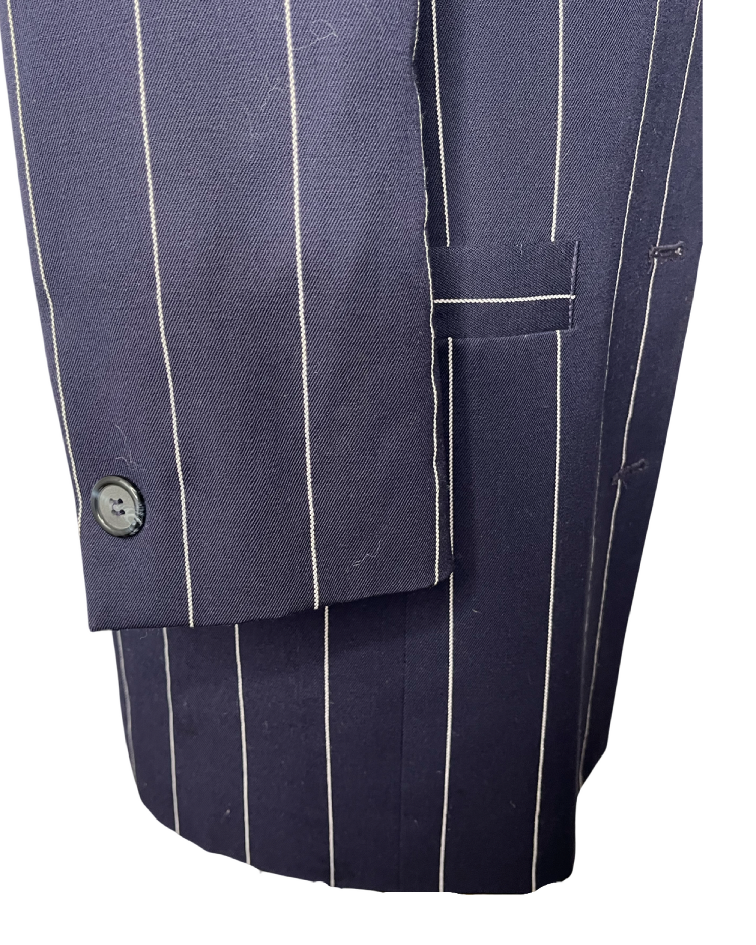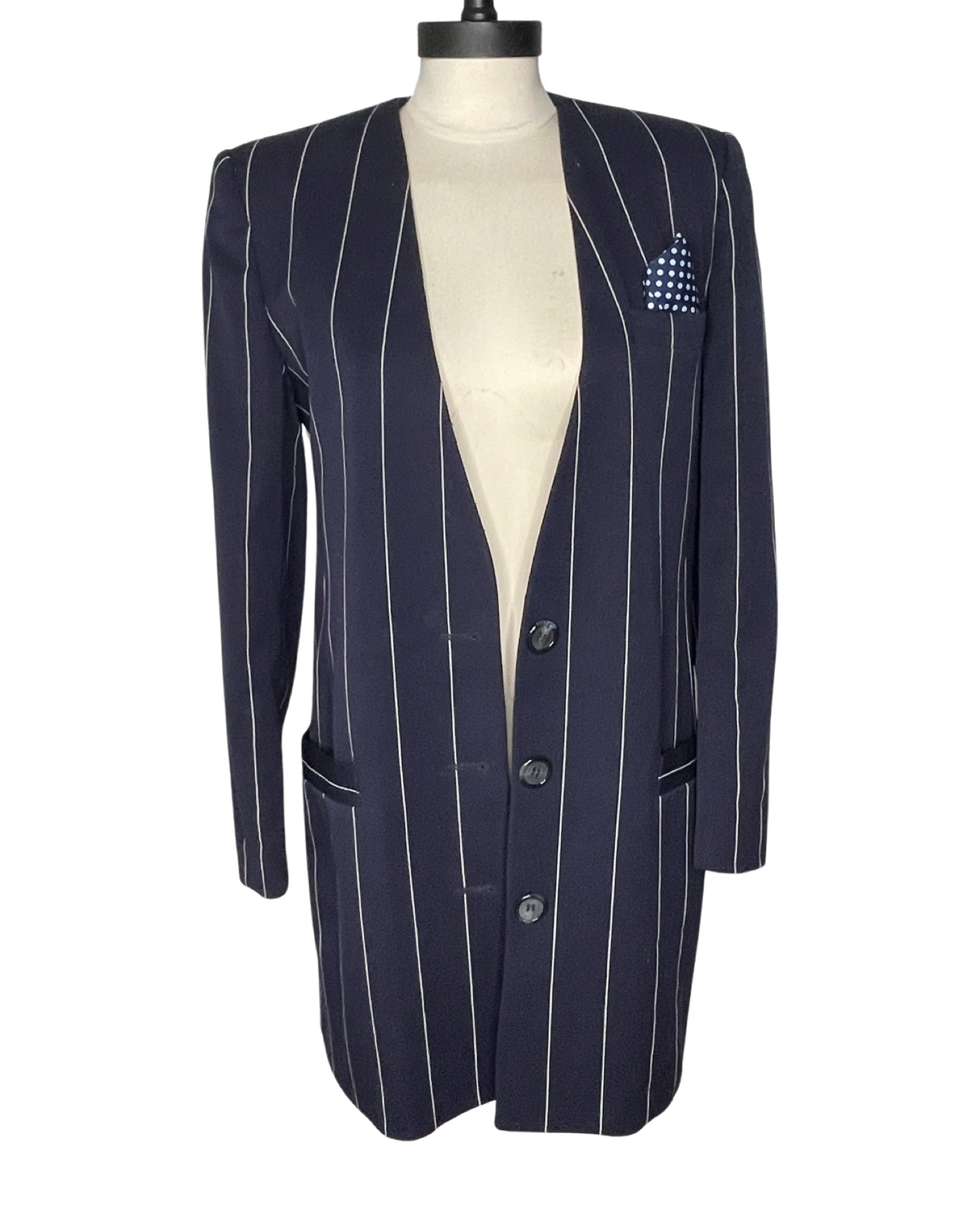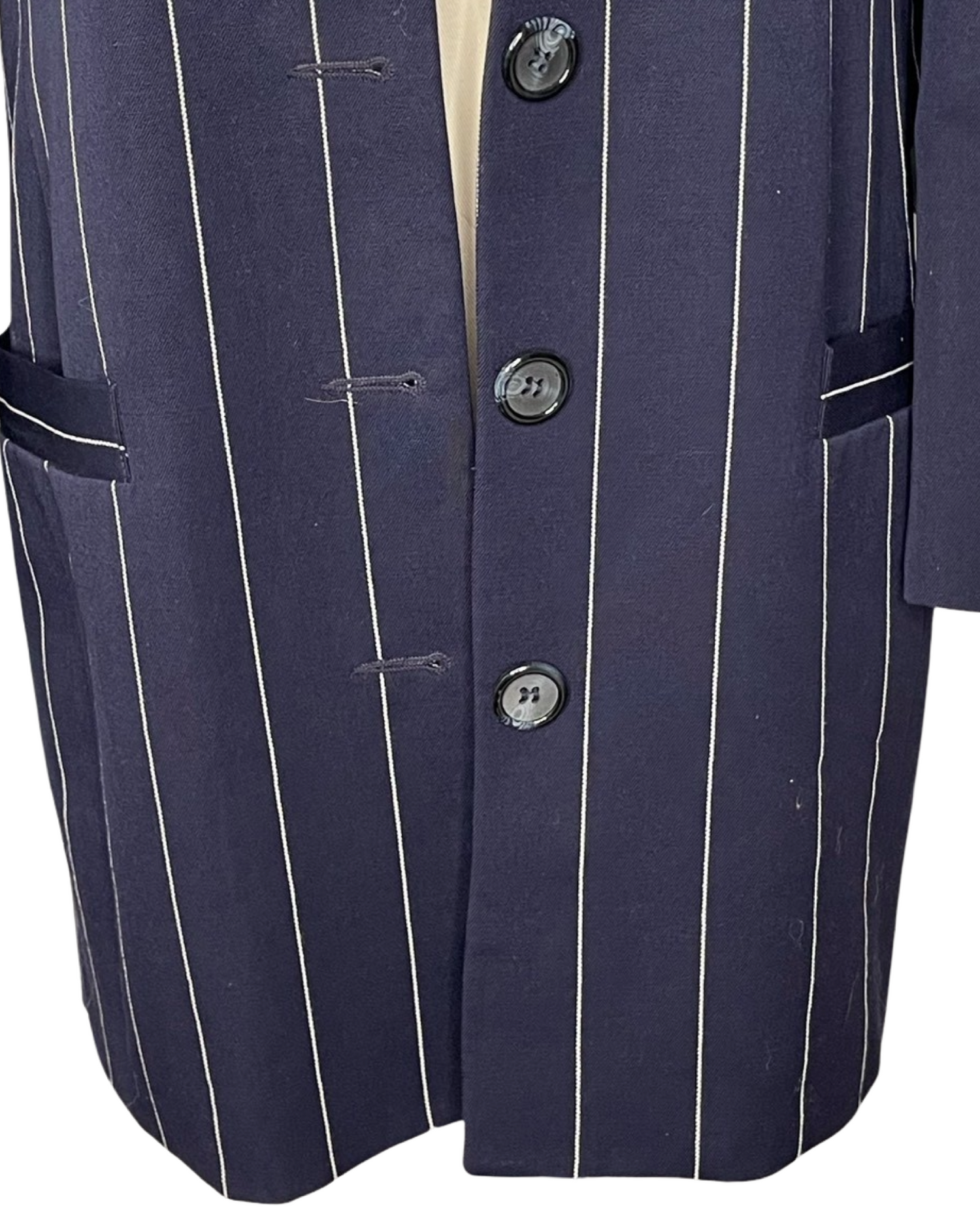 This elegant blue pin stripe blazer from Christian Dior is a vintage piece from the 1990s. It is made of high-quality 100% wool material and features a sophisticated suit jacket/blazer style that can be worn on formal occasions as well as casual for a polished look.