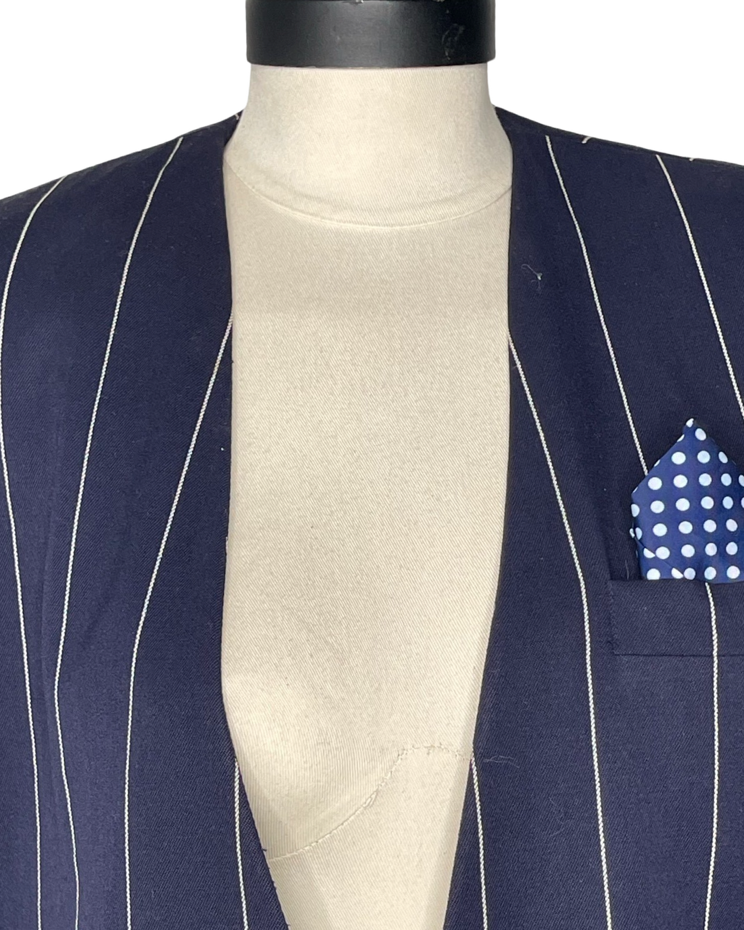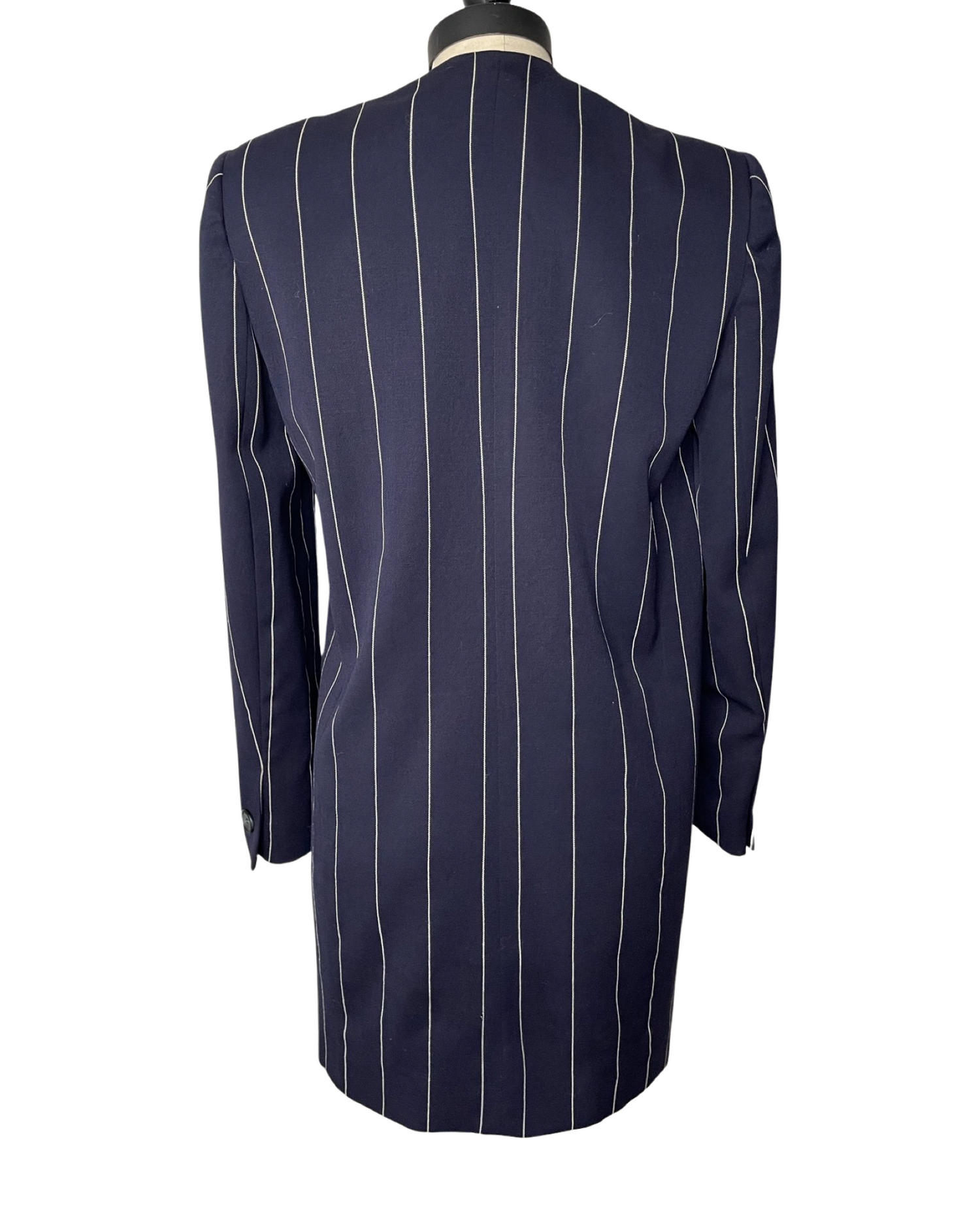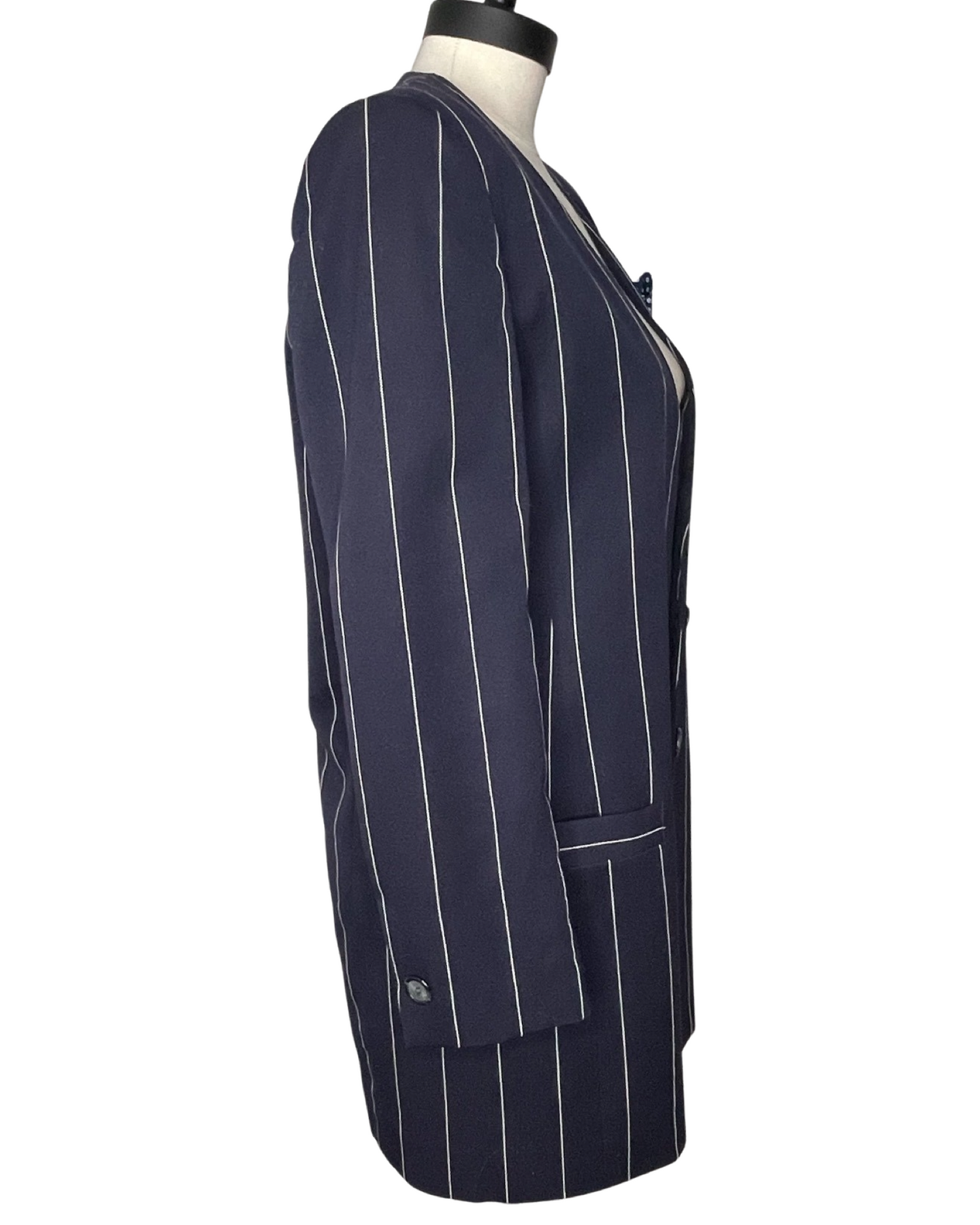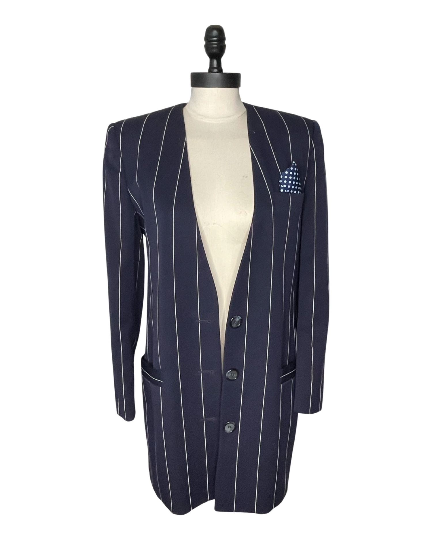 This elegant blue pin stripe blazer from Christian Dior is a vintage piece from the 1990s. It is made of high-quality 100% wool material and features a sophisticated suit jacket/blazer style that can be worn on formal occasions as well as casual for a polished look.